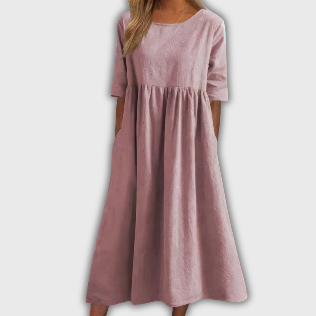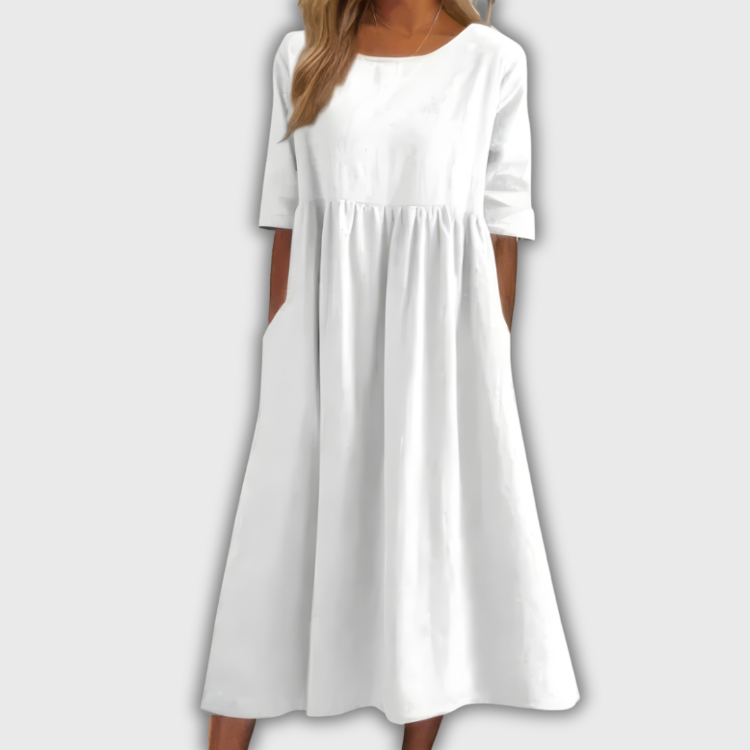 Ένα φόρεμα που συνδυάζει τέλεια την ελευθερία και την κομψότητα σε αρμονία. Η χαλαρή γραμμή κολακεύει τη σιλουέτα και προσφέρει μια άνετη εμπειρία χρήσης - όλη μέρα. Είτε για χαλαρές βόλτες, ραντεβού για καφέ είτε για ειδικές περιστάσεις: αυτό το φόρεμα προσδίδει διαχρονική γοητεία σε κάθε περίσταση.