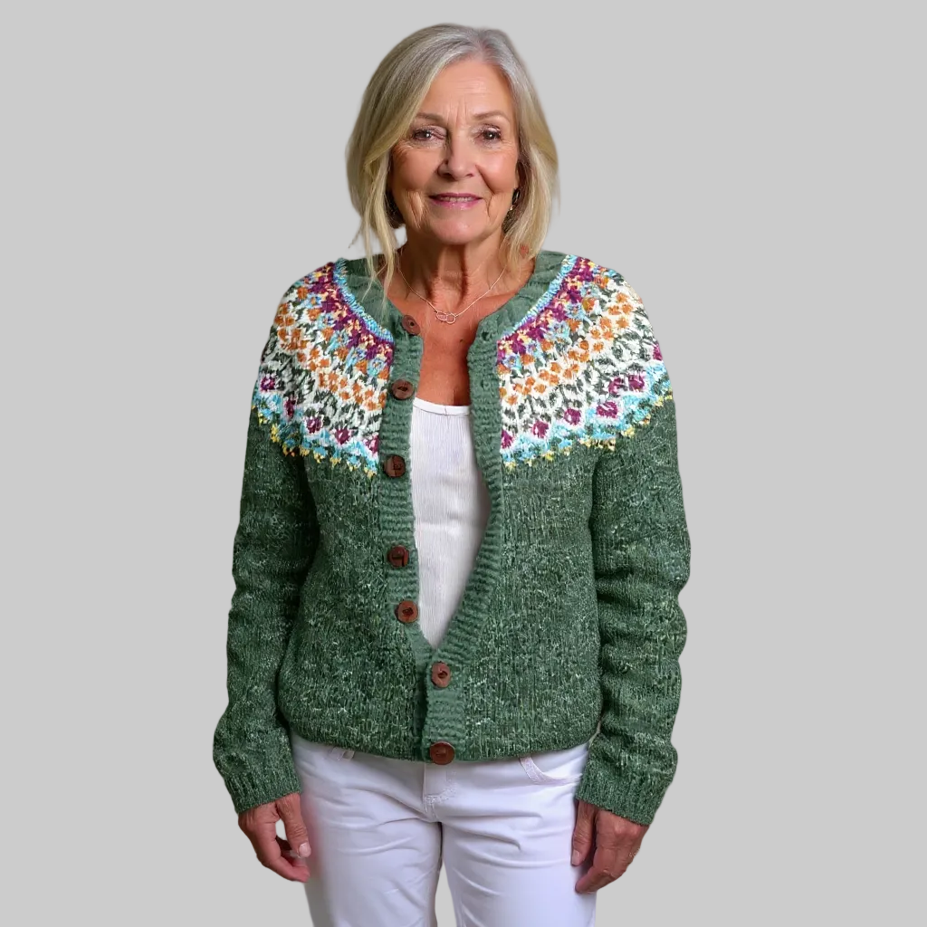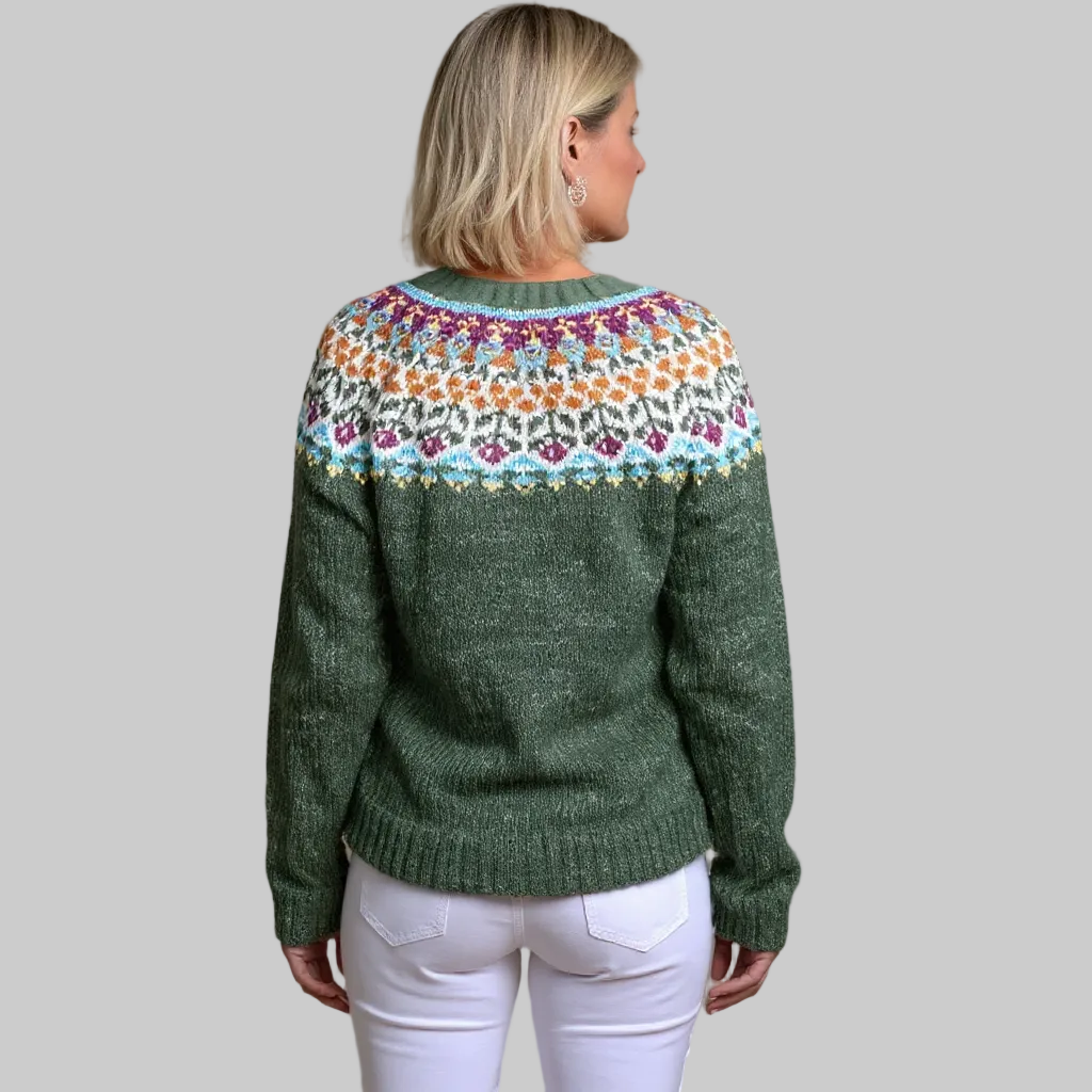 Αυτό το ζεστό vintage ισλανδικό καλάθι συνδυάζει ένα διαχρονικό σχέδιο με μια έκρηξη χρώματος. Με γεωμετρικά σχέδια σε έντονες αποχρώσεις του πράσινου, του πορτοκαλί και του λευκού, προσφέρει μια μοντέρνα πινελιά στα παραδοσιακά σκανδιναβικά μοτίβα. Το μπροστινό μέρος με κουμπιά και το απαλό, λεπτό ύφασμα εξασφαλίζουν άνεση και ζεστασιά, καθιστώντας το ιδανικό για να το φορέσετε πάνω από καθημερινά ρούχα τις πιο κρύες μέρες.