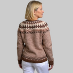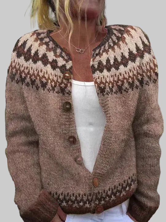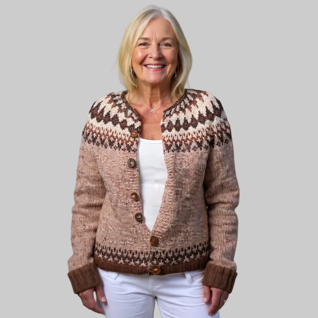 Αυτό το άνετο vintage ισλανδικό ζακετάκι διαθέτει απαλή καφέ βάση με ένα όμορφο γεωμετρικό σχέδιο στο καστανό και κρεμ φινίρισμα. Το μπροστινό μέρος με κουμπιά και το λεπτό ύφασμα προσφέρουν ζεστασιά και άνεση, καθιστώντας το ιδανικό κομμάτι για layering τους κρύους μήνες. Αυτό το καρότσι συνδυάζει τα παραδοσιακά βόρεια στυλ με μια μοντέρνα, κομψή χρωματική παλέτα, προσφέροντας στυλ και άνεση.