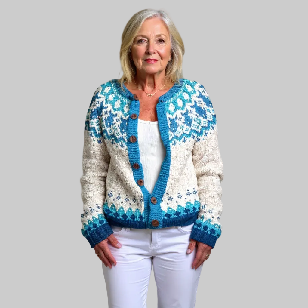Αυτό το vintage ισλανδικό παλτό συνδυάζει την άνετη ζεστασιά με την κομψή, ρετρό γοητεία. Το απαλό ύφασμα εξασφαλίζει ζεστασιά, ενώ η όμορφα διακοσμημένη λαιμόκοψη προσθέτει μια πινελιά χρώματος με τις εντυπωσιακές μπλε και λευκές αποχρώσεις του. Τα ξύλινα κουμπιά του δίνουν μια ρουστίκ αίσθηση, καθιστώντας το ιδανικό για να το φοράτε πάνω από τα αγαπημένα σας ρούχα. Είτε φοριέται καθημερινά είτε πιο επίσημα, αυτό το σακάκι προσφέρει μια εκλεπτυσμένη κομψότητα στην γκαρνταρόμπα σας.