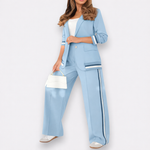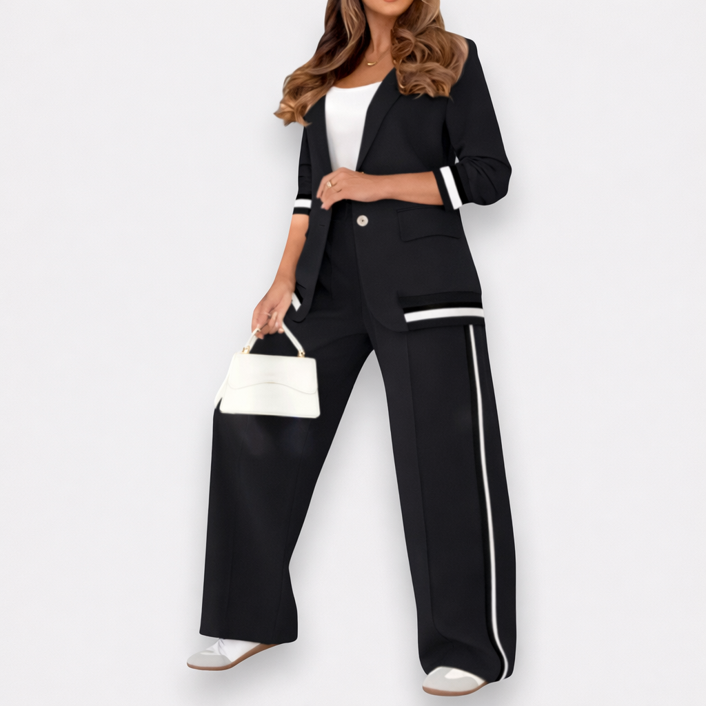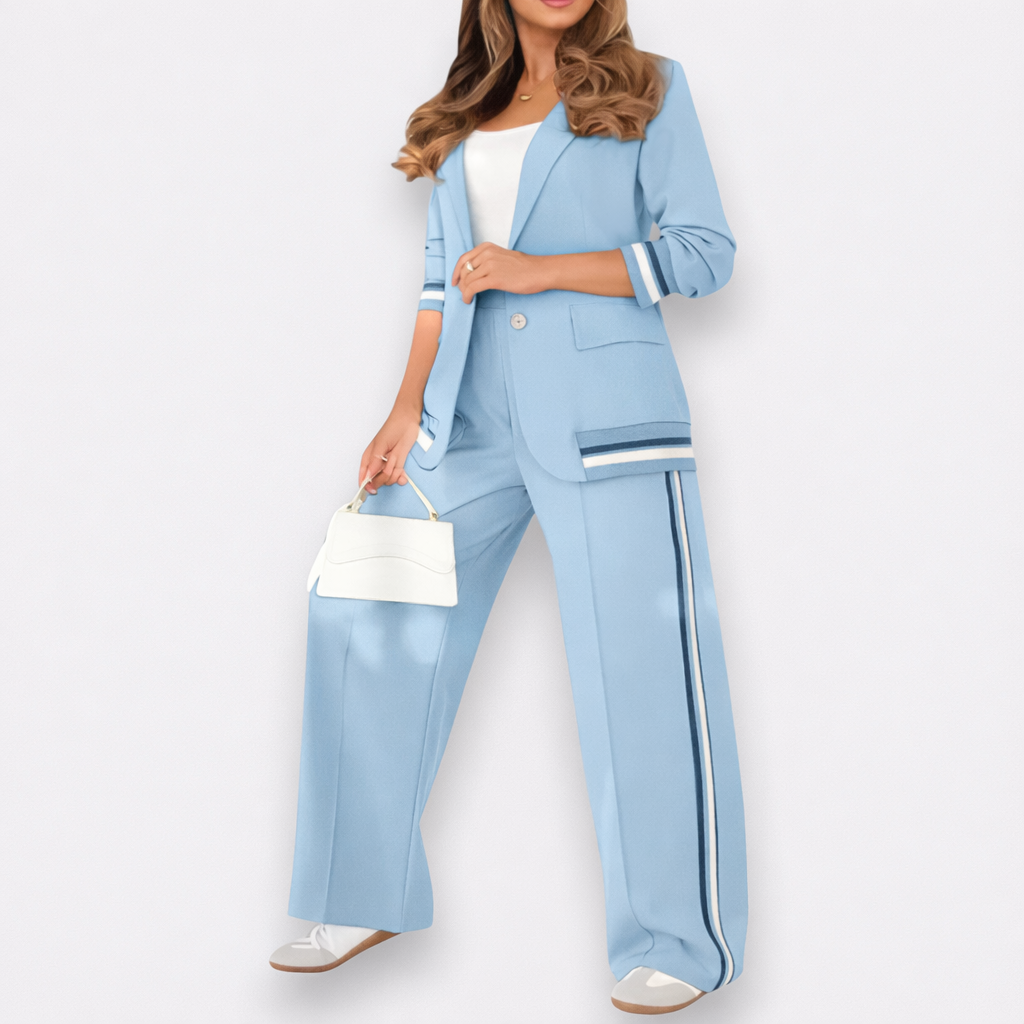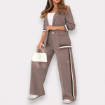 Αυτό το μοντέρνο σετ δύο τεμαχίων συνδυάζει την επαγγελματική κομψότητα με την αστική κομψότητα. Το ελαφρώς ραμμένο σακάκι και το παντελόνι με τη φαρδιά μέση δημιουργούν μια εμφάνιση που είναι ταυτόχρονα επαγγελματική και χαλαρή. Ιδανικό για γυναίκες που εκφράζουν στυλ και αυτοπεποίθηση - είτε στο γραφείο, είτε σε συναντήσεις, είτε σε εκδηλώσεις μετά τη δουλειά.